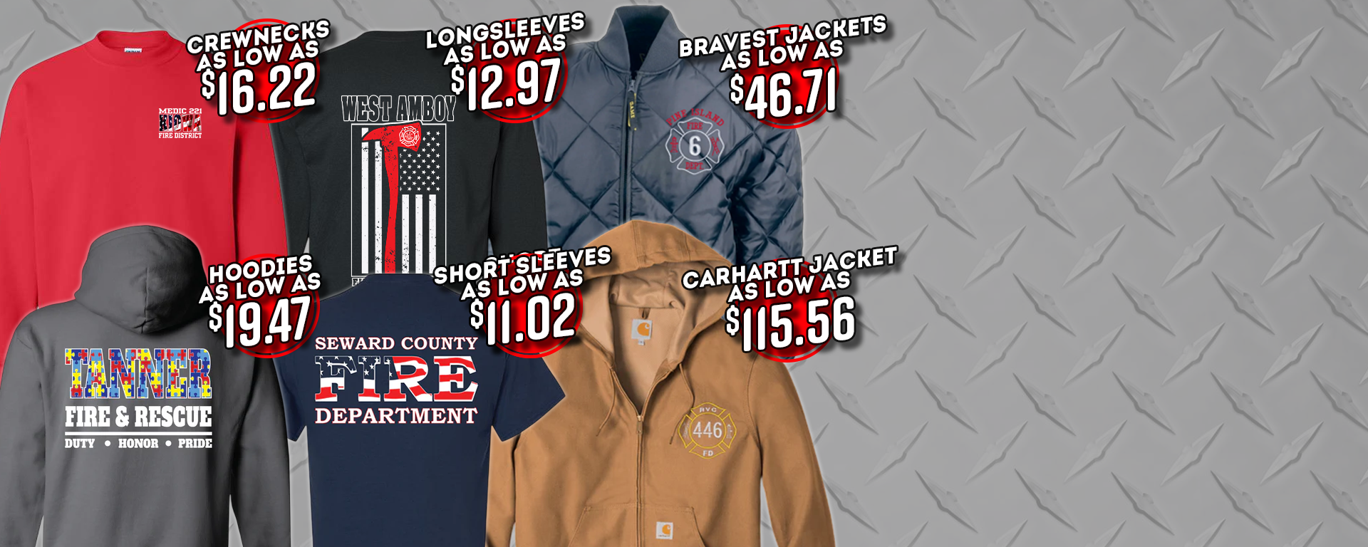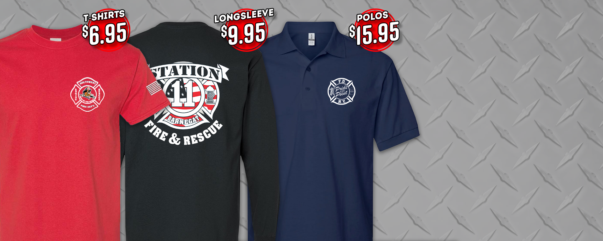 Much of our work consists of group orders to both paid and volunteer firefighters.Our screen-printing process, which is done on-site, allows us to offer some of the best pricing and turnaround times in the industry.We are able to print many different styles of apparel, ranging from your basic fire department shirts to customized firefighter work shirts. Our full-time art staff works directly with our customers to create new concepts and to re-create designs you already use.
