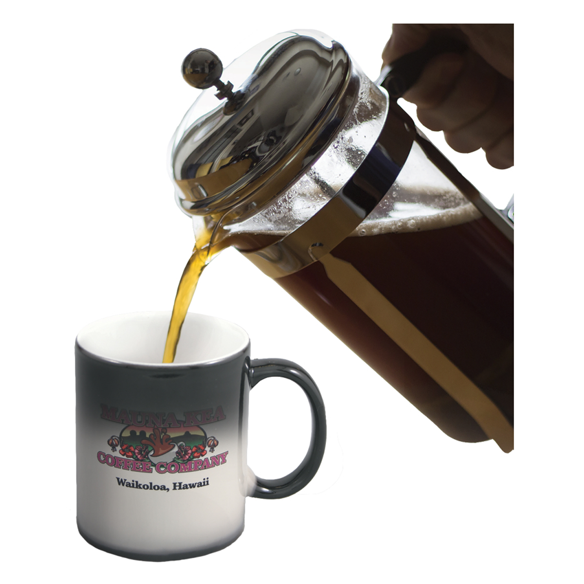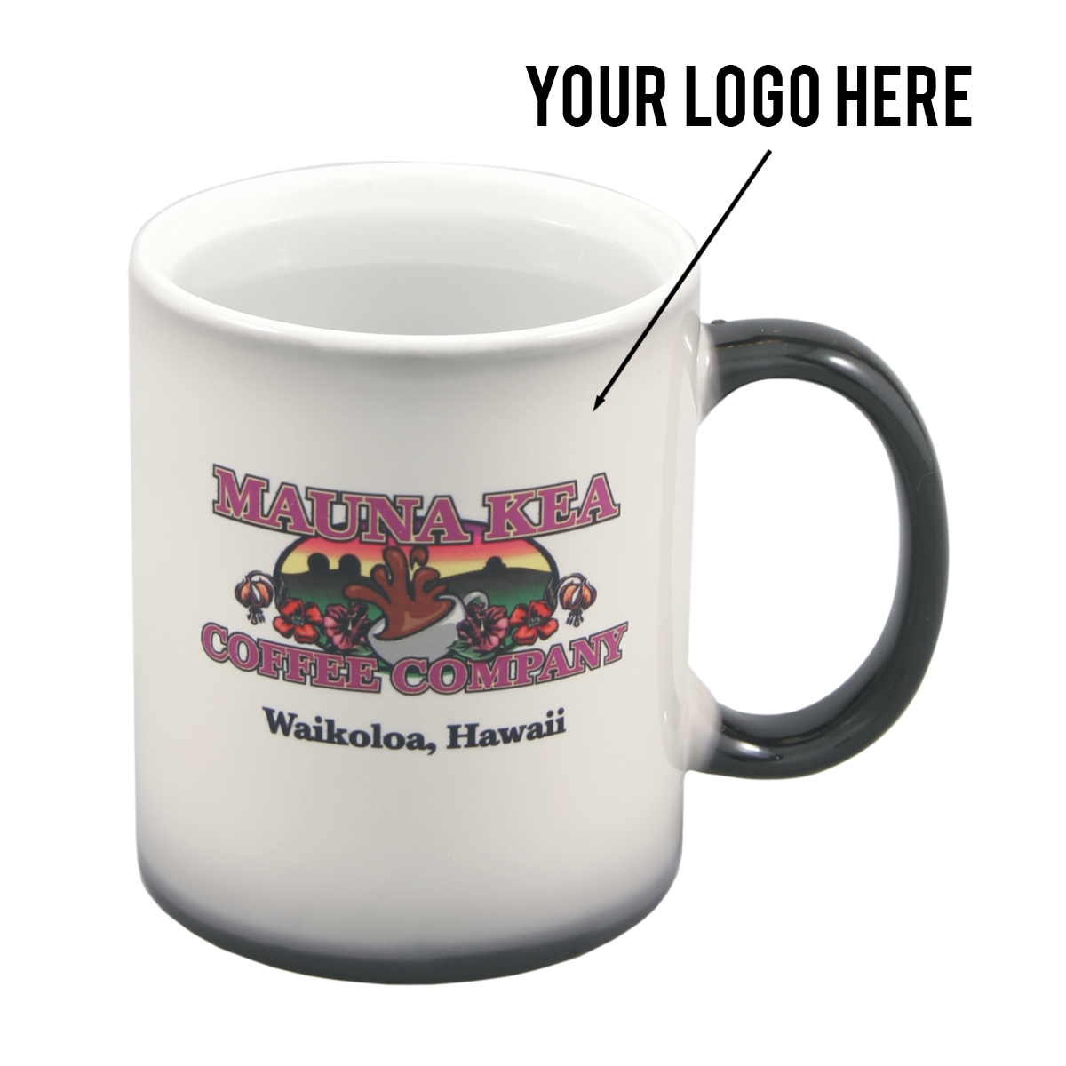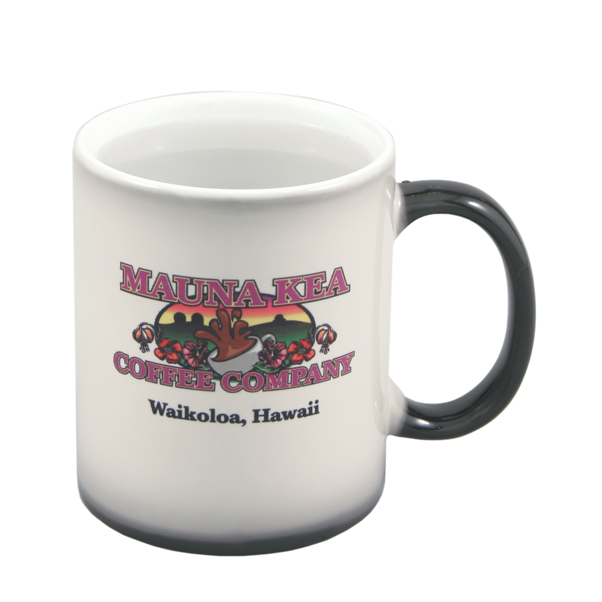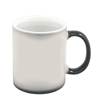 This 11 oz. ceramic mug features a black and white design that changes color when filled with a hot liquid, revealing a full color print. It can be customized for a personalized touch. Enjoy your favorite beverages in style with this unique and eye-catching mug.