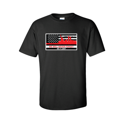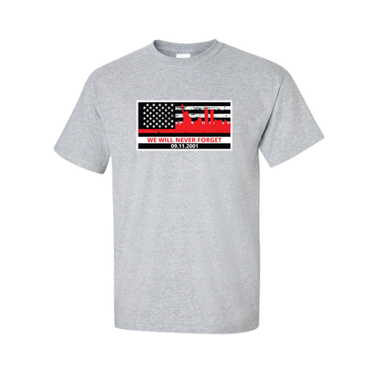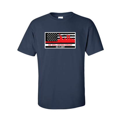 Show support for the brave firemen and firewomen who risked their lives to save those on 9/11. This firefighter shirt design features a distressed flag design and is only available in one color.