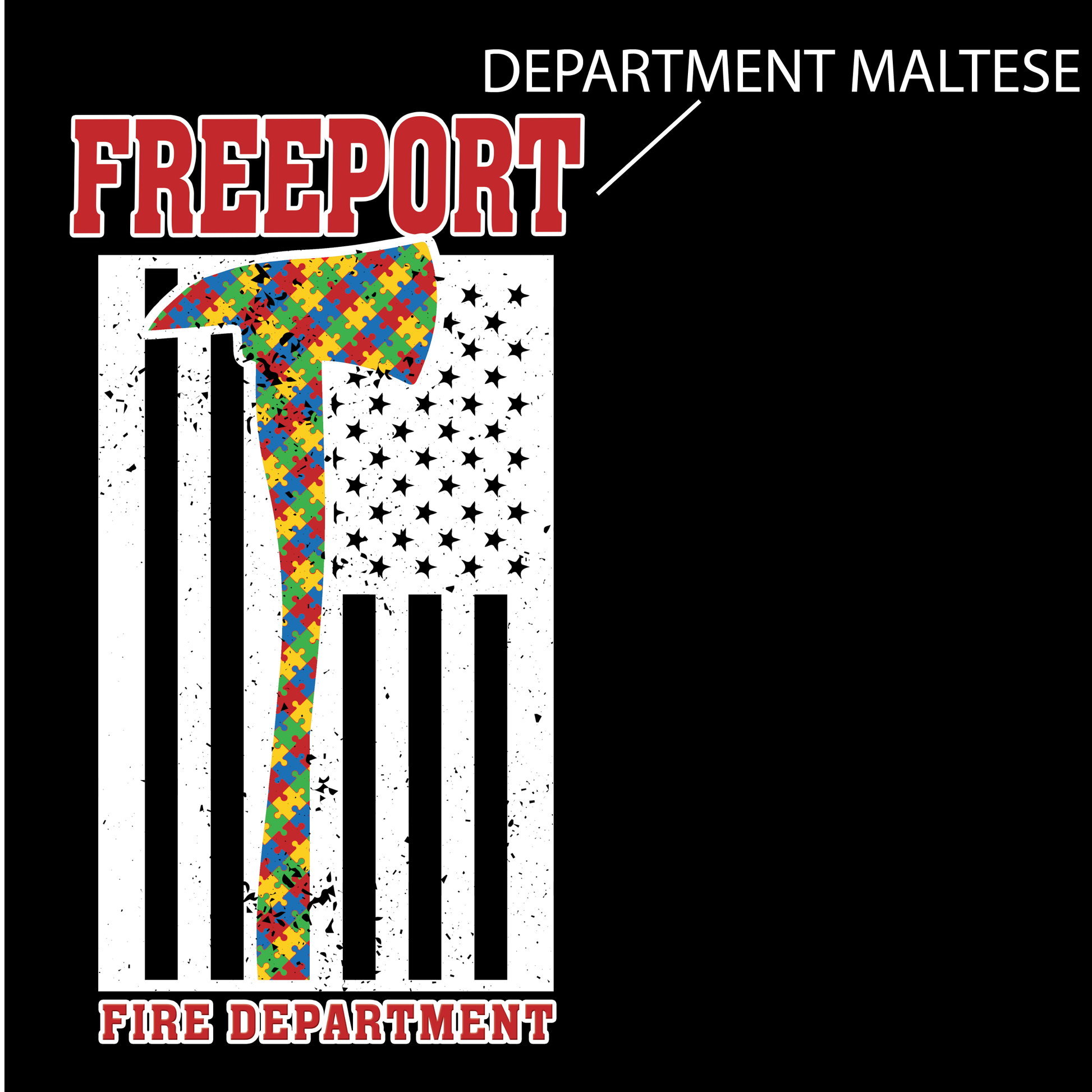 The back features a striking distressed American flag with a full-length fire axe rendered in the iconic autism awareness puzzle piece pattern, with "Freeport" in bold red lettering above and "Fire Department" below. The front left chest carries the Maltese cross Fire Dept badge with crossed puzzle piece axes — the timeless symbol of the brotherhood, reimagined as a statement of community advocacy.