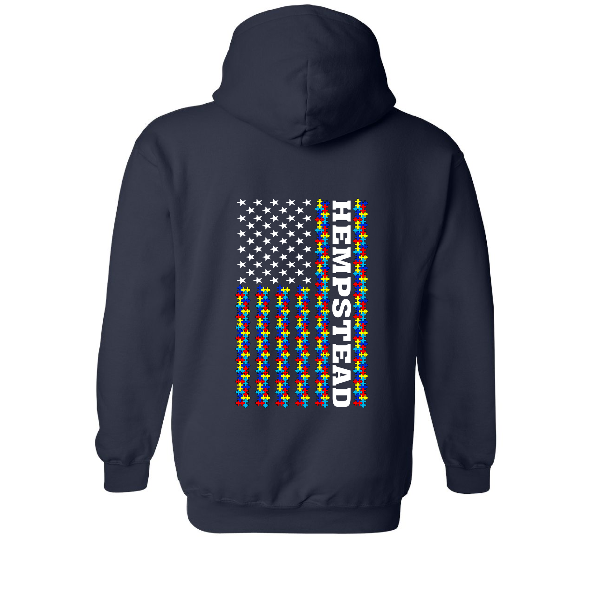 Q: What is the Autism Awareness Puzzle Flag Hoodie? A: The Autism Awareness Puzzle Flag Hoodie is a customizable navy firefighter pullover featuring a full American flag graphic where every stripe is made of autism awareness puzzle pieces. Your fire department name is printed vertically through the flag on the back, and the front left chest displays a Maltese cross badge with a colorful autism awareness puzzle piece center. It can be personalized for any fire department in the country.