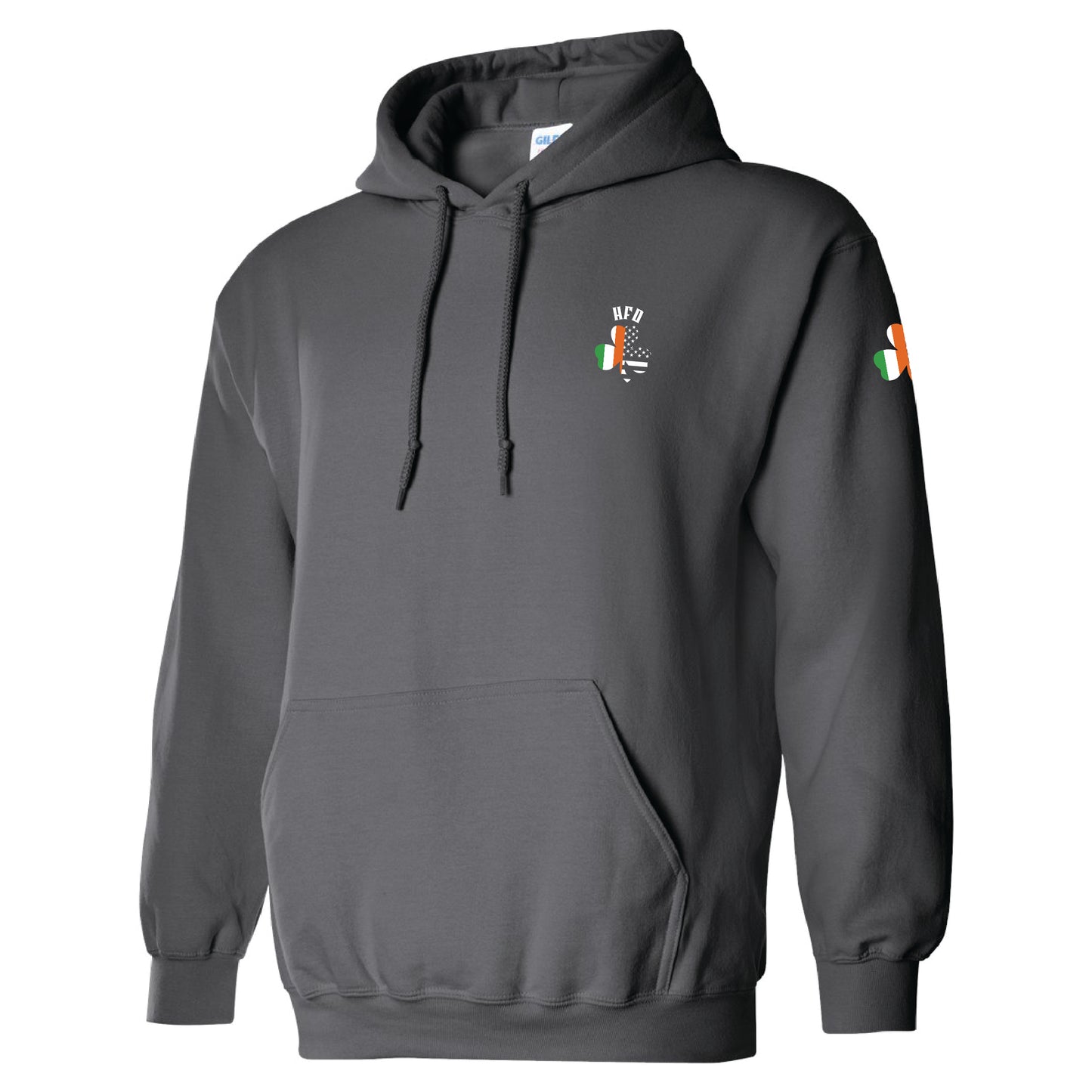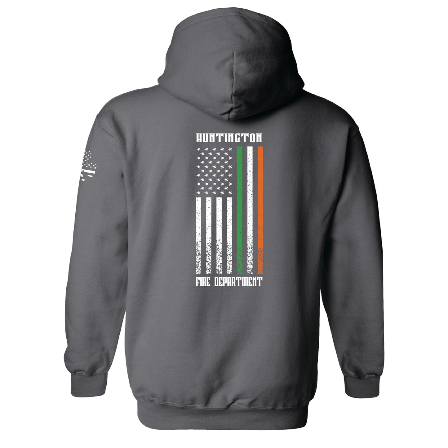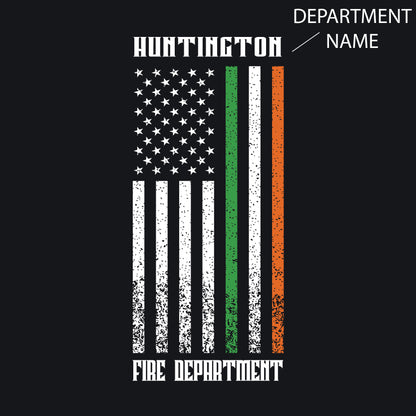 Enhance your firefighter style with our Irish/American Flag Clover Design Hoodie. Featuring custom prints of clover design, Irish and American flags on the front, back, and sleeve, each hoodie is custom-made for your firehouse. No minimum required. Show your pride in a professional way.