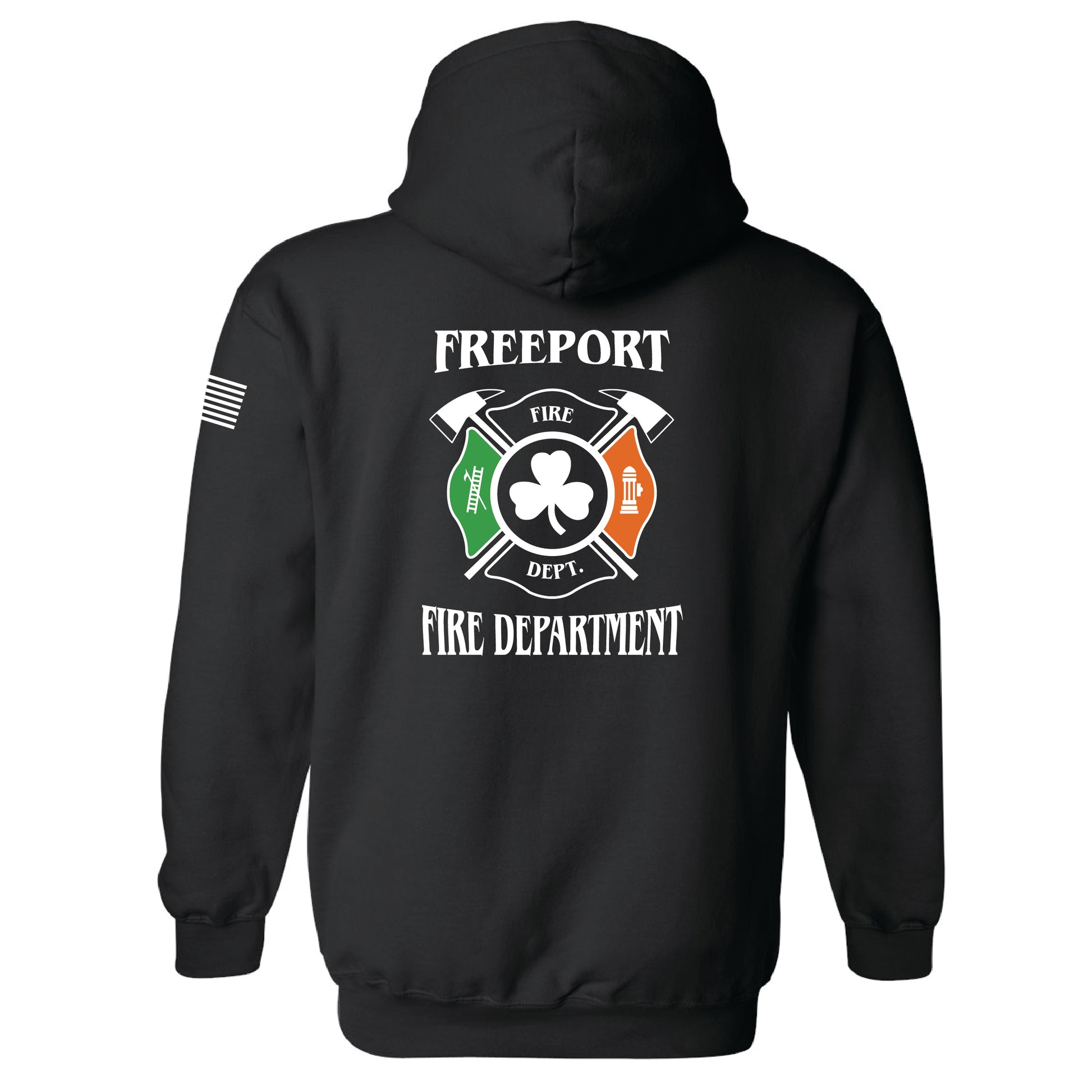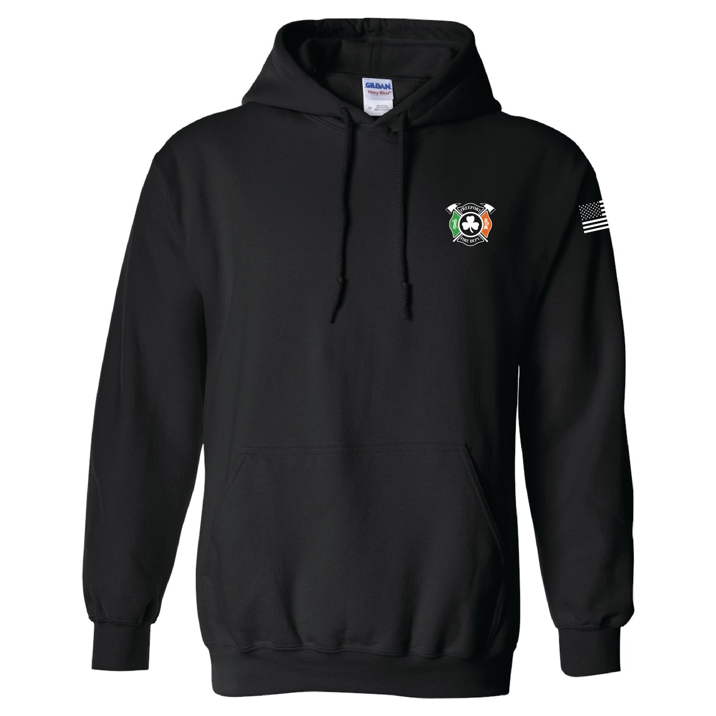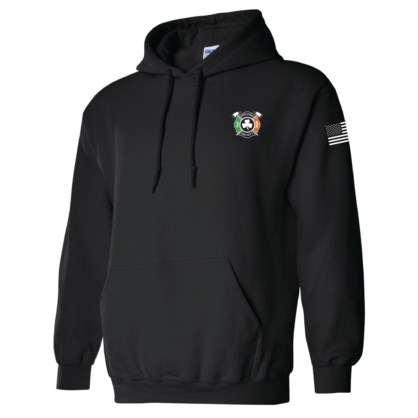 As a product expert, I present the Irish Flag Maltese Design, Firefighter Hoodie. This fully custom made hoodie showcases a custom printed Irish design on the front, back, and sleeve. It also includes the department name on both the front and back, making it the perfect way to represent your pride and passion as a firefighter.