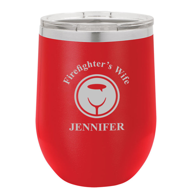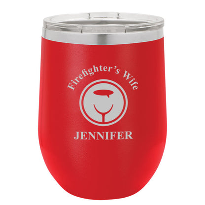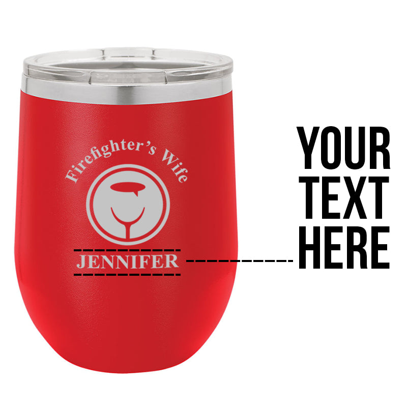 Tumbler comes with Firefighter's Wife Let's Talk Wine design and may be customized with personalized text below the design such as a name or fire department.