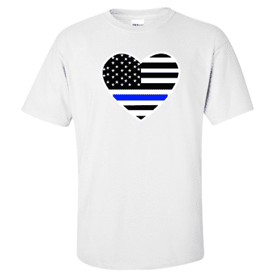This Thin Blue Line "Patriotic Heart" Police Officer Shirt features a Heart with a Stars and Stripes design background with a Thin Blue Line for one of the Stripes.