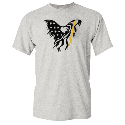 This Thin Gold Line "Patriotic Eagle" Dispatcher Shirt features an Eagle with the wings having a Stars and Stripes design with a Thin Gold/Yellow Line for one of the Stripes.