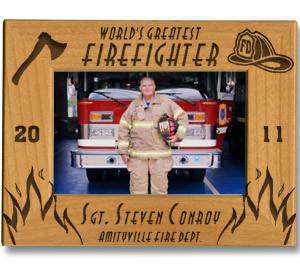 This laser-engraved Firefighter picture frame can be customized for any firefighter and department. This World's Greatest Firefighter will come as pictured here. Just enter the name you would like to appear on the bottom of the frame first in the Name box. Next, enter in the Fire Department name - we will put exactly what you put in theFire Department box. Last - write in the date you would like to use on the frame in the Date box. We will split the date like shown in the picture. If you have any questions about the engraving please call Customer Service.
